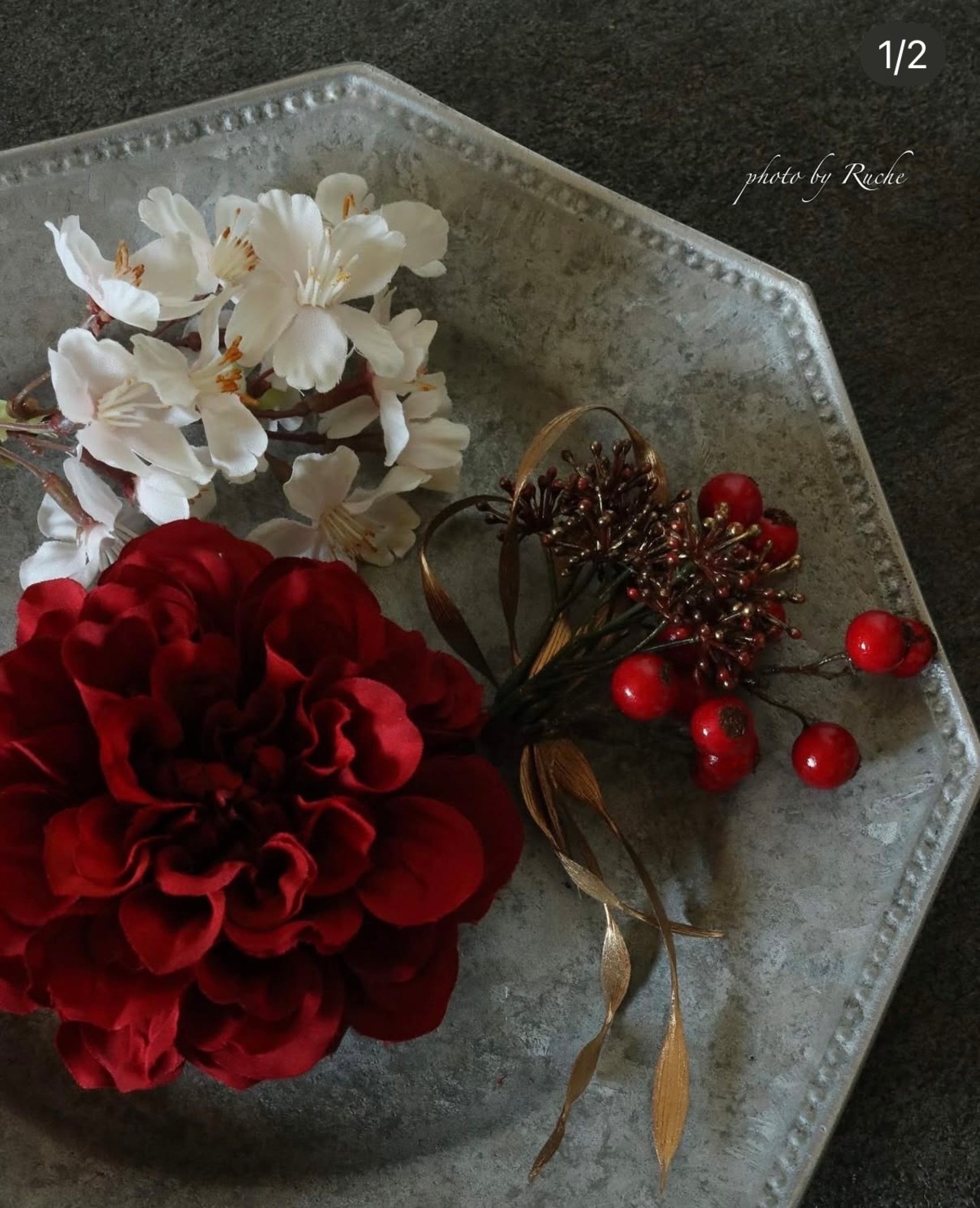 髪飾りの個数についてですが、メインの花飾り(大きめサイズ)のものを一つ、それから小さめの花飾りを左右に付けられるように4,5点程ご用意しております。