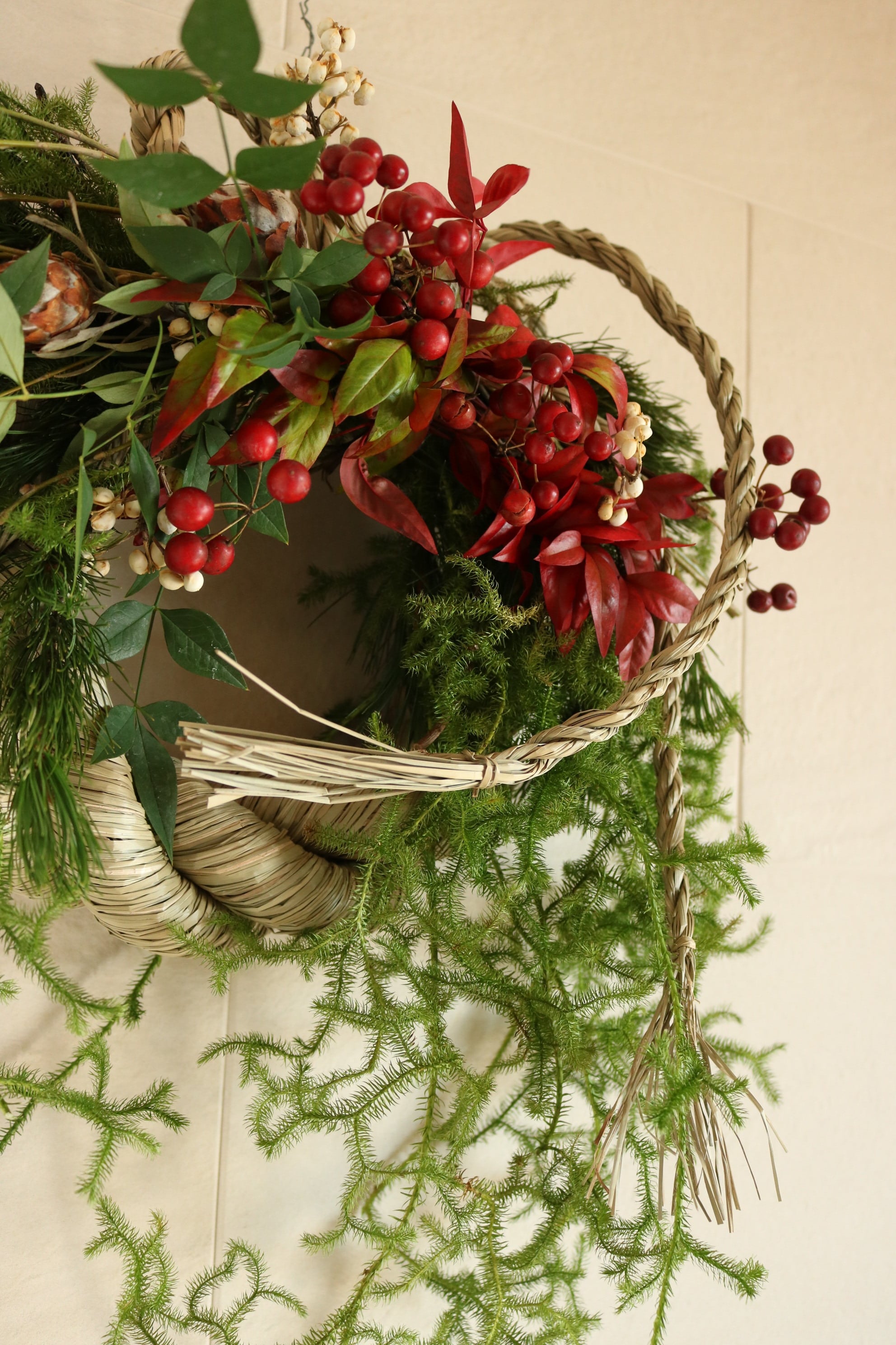大きな雲竜型のしめ縄に長く垂らしたヒカゲカズラやおたふく南天、赤い実などをあしらった豪華なお飾りです。
